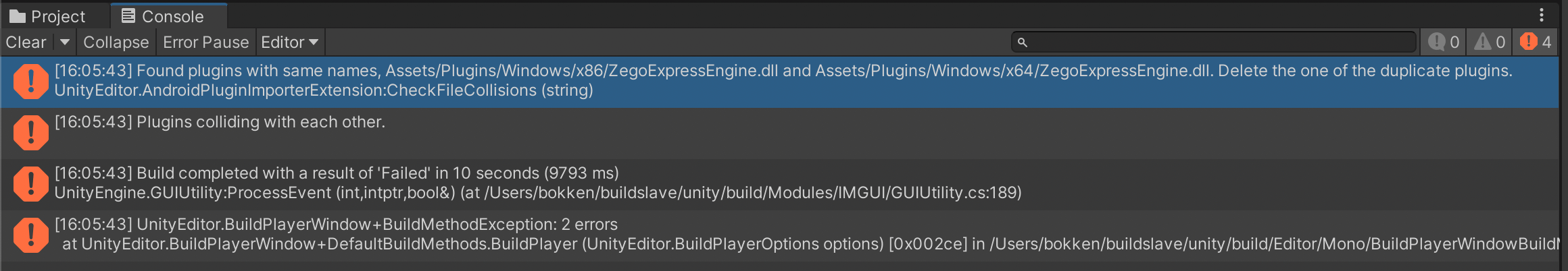 A ".dll" file with the same name cannot exist in a Unity project, otherwise a "Multiple plugins with the same name 'zegoexpressengine'" error will occurred during Build. Developers need to delete the "x64" folder or "x86" folder under the "Plugins/Windows" folder according to the actual business situation. If you do not plan to run your app on Windows platform, you can delete the "Plugins/Windows" folder directly.