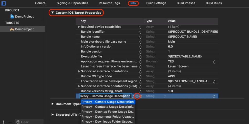 In Xcode, select your target project and go to Info > Custom iOS Target Properties.