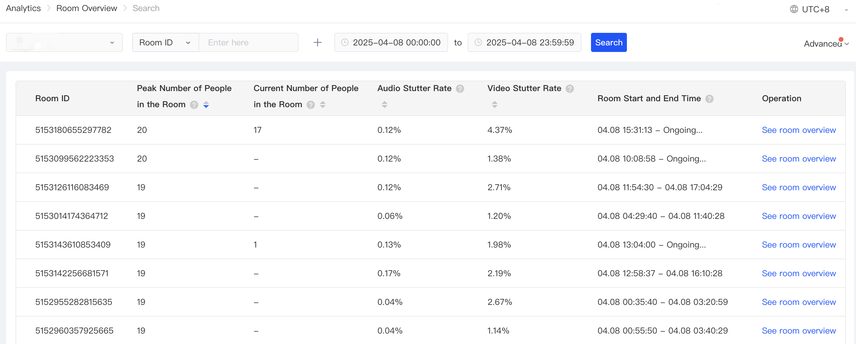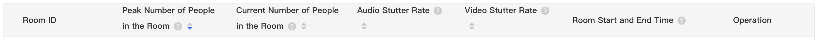 - The fields included in the room record list are: room ID, peak in-room user count, current in-room user count, audio stutter rate, video stutter rate, room start and end time, and operation; support sorting the peak in-room user count, current in-room user count, audio stutter rate, video stutter rate fields, and the default is to sort by peak in-room user count.