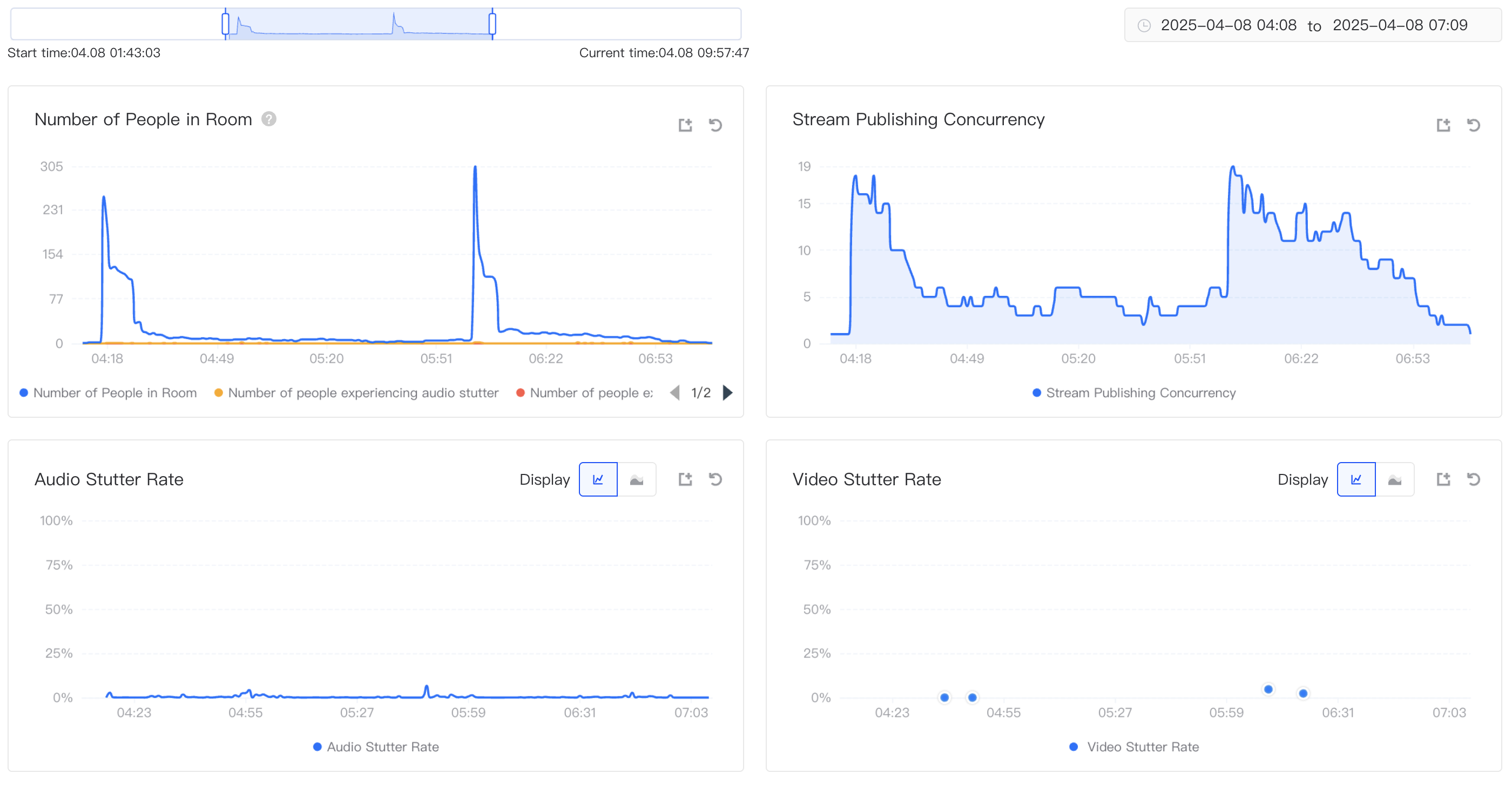 The room basic information below is the room experience trend module, which displays the dynamic change trend of the in-room user count, push stream concurrency, audio stutter rate, and video stutter rate in the set time range. Through an intuitive chart, users can clearly observe the fluctuation of each indicator over time, making it easier to analyze the regularities and abnormal points in the room operation process.