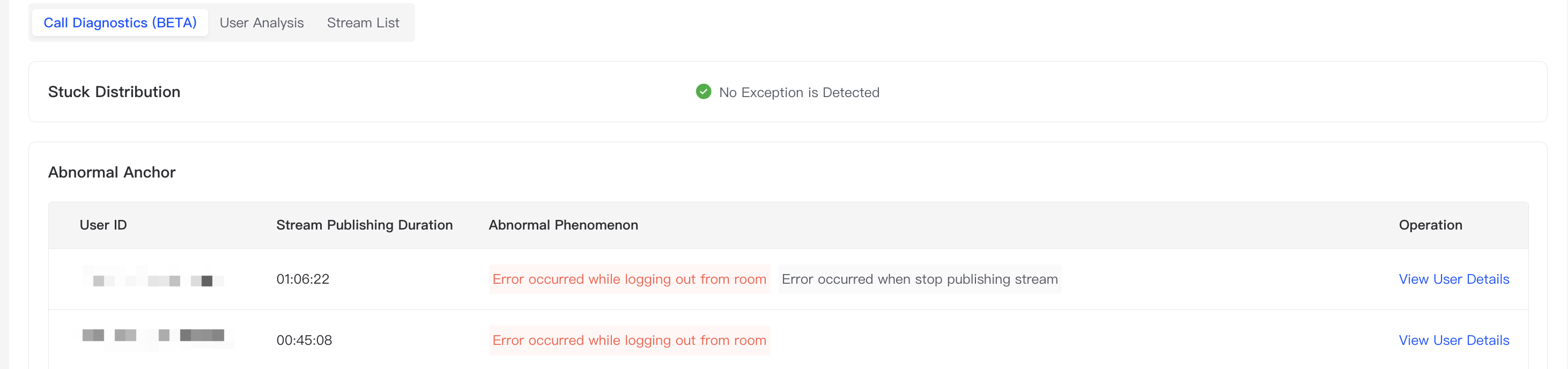 By clicking the "View User Details" button, you can quickly jump to the Analytics Dashboard user monitoring details page, making it easy to further understand the detailed information of abnormal anchors. This allows you to promptly address anchor abnormalities and ensure the normal operation of audio and video services in the room.