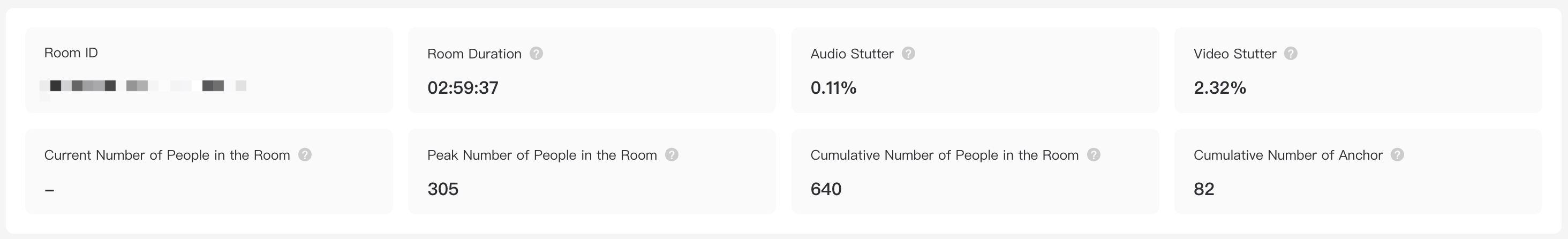 The top of the room details page is the room basic information module, which displays the basic indicators such as room duration, current in-room user count, peak in-room user count, total in-room user count, total push stream user count, audio/video stutter rate, etc., helping users quickly understand the room scale and in-room user experience.